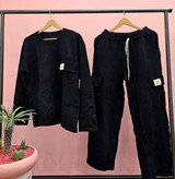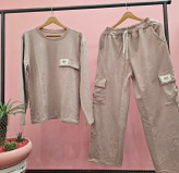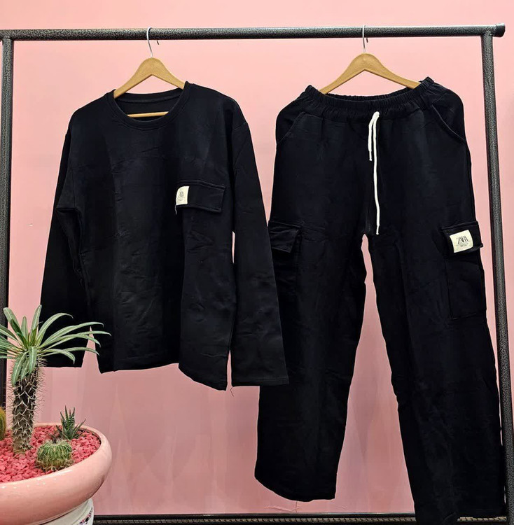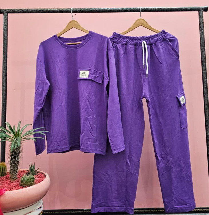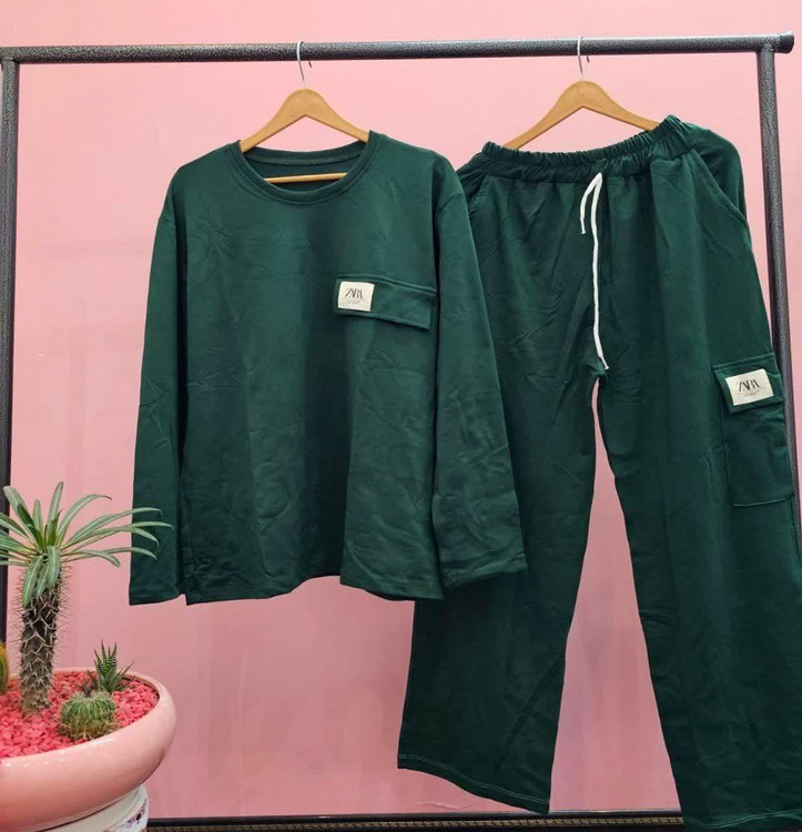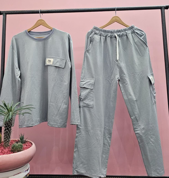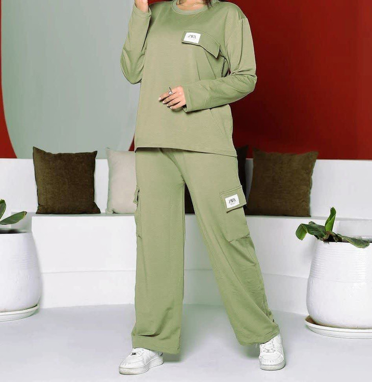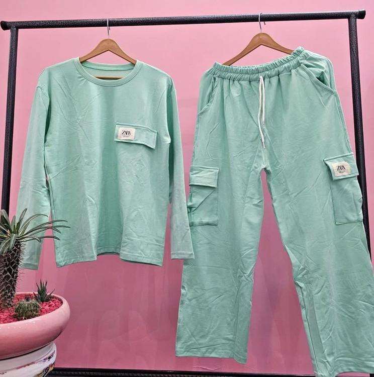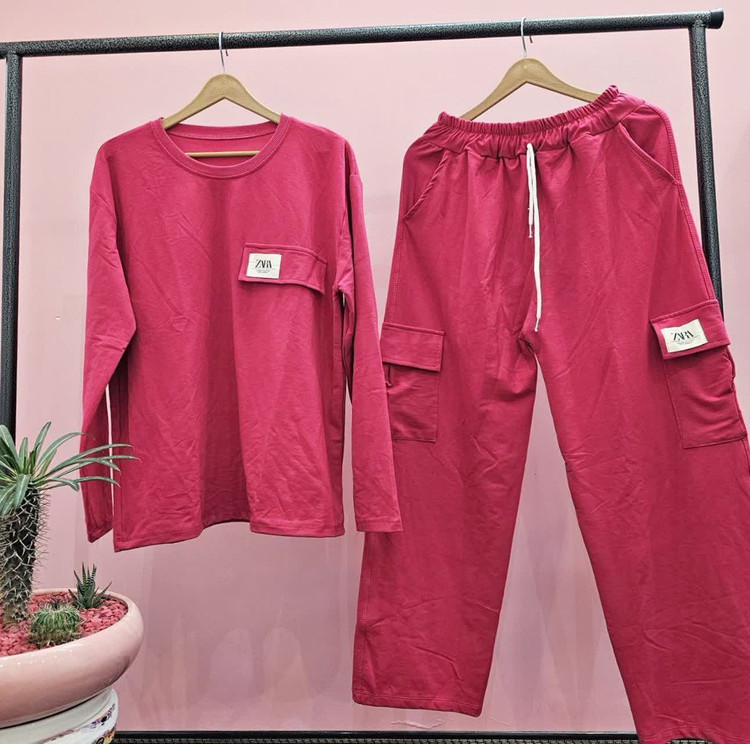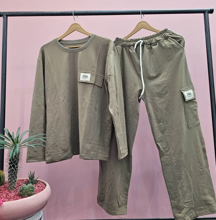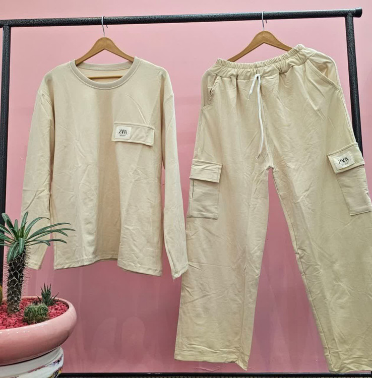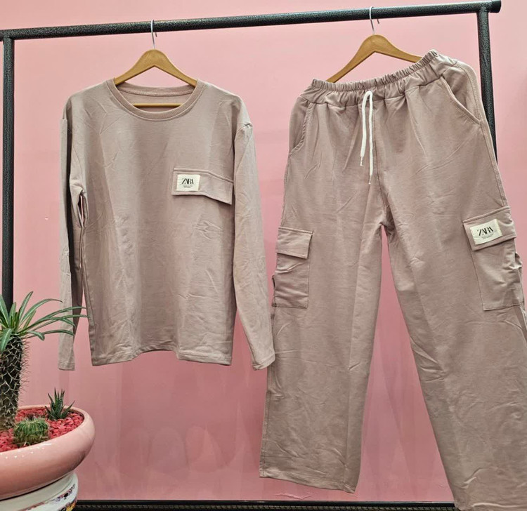 ست زنانه دخترانه بلوز جیب نما شلوار بگ کارگو جیب دار کمر کش چاپ ZARA با رنگ بندی و تنخور با تنخور دلبرش