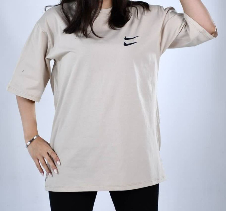 تیشرت زنانه دخترانه لانگ لش قواره بزرگ جنس سوپر نخ پنبه بغل چاکدار چاپ نایک با تنخور راحت و شیک