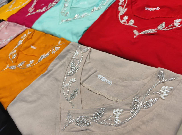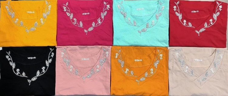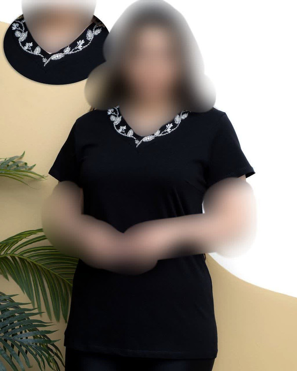 تیشرت زنانه دخترانه یقه هفت منجوق دوزی کار دست قاپکدار جنس سوپر نخ پنبه بسیار نرم و لطیف با تنخور فوق العاده شیک و جذاب
