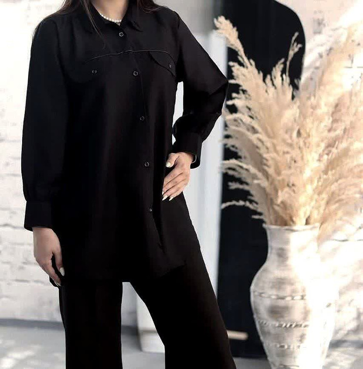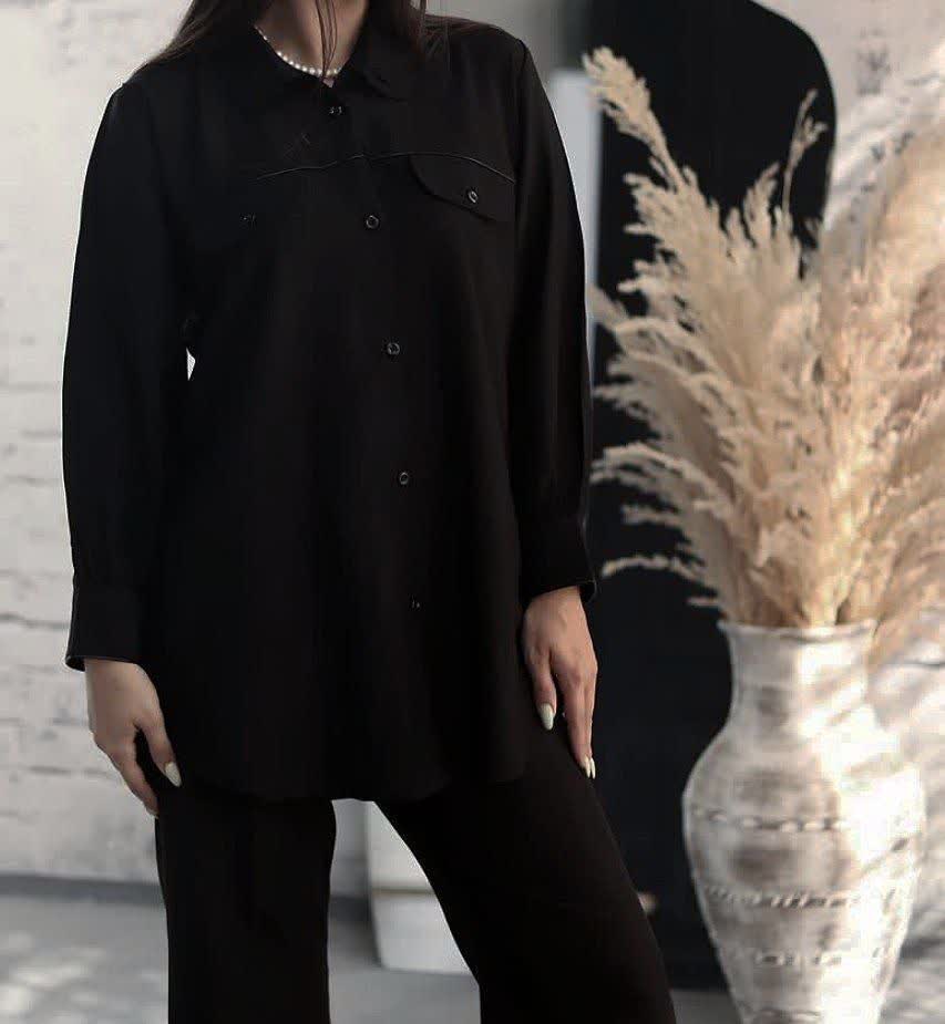 🔵 شومیز جیب نما آستین بلند (مچی دکمه خور) پیله دار،جلو و سر آستین قیطون دوزی شده،با تنخور ساده و شیک مناسب ایام محرم و صفر
