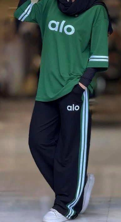 ست زنانه دخترانه تیشرت لش شلوار بگ جیب دار کمر کش بغل نوار چاپ alo با رنگ بندی و تنخور بسیار شیک