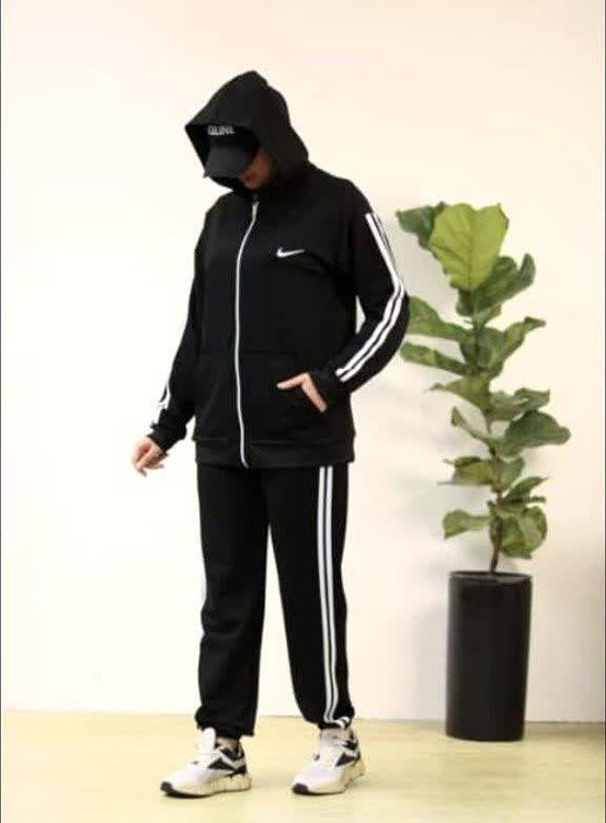 🔵 ست (هودی) سویشرت جلو جیب و کلاهدار + شلوار اسلش بغل نوار چاپ نایک با تنخور بسیار شیک